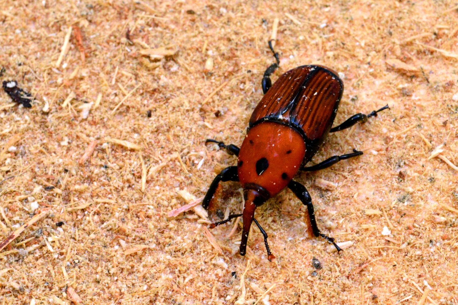 El picudo rojo, cuyo nombre científico es Rhynchophorus ferrugineus, es un escarabajo invasor que ataca principalmente a distintas especies de palmeras. Los adultos miden entre 2 y 5 cm, presentan un característico color rojizo y un llamativo rostro alargado en forma de pico. Sus larvas, de gran tamaño y voracidad, se desarrollan en el interior del estípite, donde excavan galerías que comprometen la estabilidad de la planta. Esta plaga puede pasar inadvertida y provocar el colapso completo de palmeras si no se actúa a tiempo.